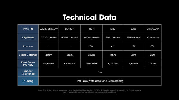 The TM9K Pro offers USB-C rechargeability with its built-in 18W QC fast-charging 5000mAh battery. It provides up to 65 hours of continuous use in its lowest mode and fully charges in just over 3 hours. A power indicator is included to notify you when it's done charging. Featuring two lockout modes, users can still access Search and Lumin Shield in Half Lockout Mode, while Full Lockout prevents accidental activation. At a size of 5.24 inches and a weight of only 8.01 ounces, the TM9K Pro is easy to take wherever you go. With an IP68 waterproof rating and 1-meter impact resistance, the TM9K Pro is a dependable companion in any situation.